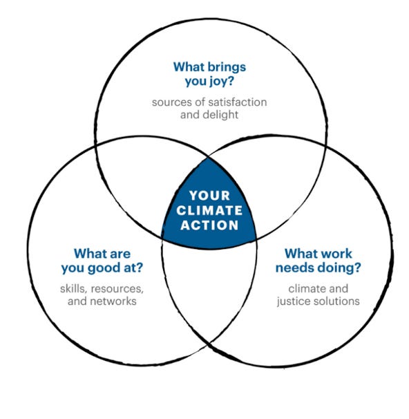 Long ago, Stephen Covey urged us to work in our circles of influence if we wanted to change anything. A more modern take on change and transformation appears in What If We Get It Right? by Ayana Elizabeth Johnson. Her subtitle is “Visions of Climate Futures. But her constructs and perspectives ring true for any kind of transformational work. Johnson challenges us to find the intersection between what brings us joy, what we are good at, and what work needs to be done. There lies the sweet spot for the actions we can take. If actions and commitments are not deeply embedded in our lives, we will indeed forget them! (Diagram from What If We Get It Right? by Ayana Elizabeth Johnson)